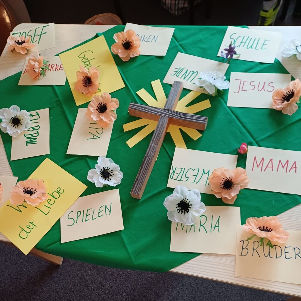 Rund um ein Kreuz lagen bereits verschiedene Begriffe wie Jesus, Maria und Josef. Auch die Kinder fanden Dinge, wofür sie dankbar sind, und durften diese Begriffe zum Kreuz dazulegen. Lukas sprach über das Trinken und das Wasser, das nicht überall selbstverständlich ist. Amalia erinnerte daran, dass viele Menschen nicht täglich genug zu essen haben. Laura wählte das Flötenspiel, Josef das Spielen überhaupt – und uns wurde bewusst, dass viele Kinder auf der Welt diese Möglichkeiten nicht haben. Auch Schule und Hausaufgaben waren für die Kinder wichtig!
