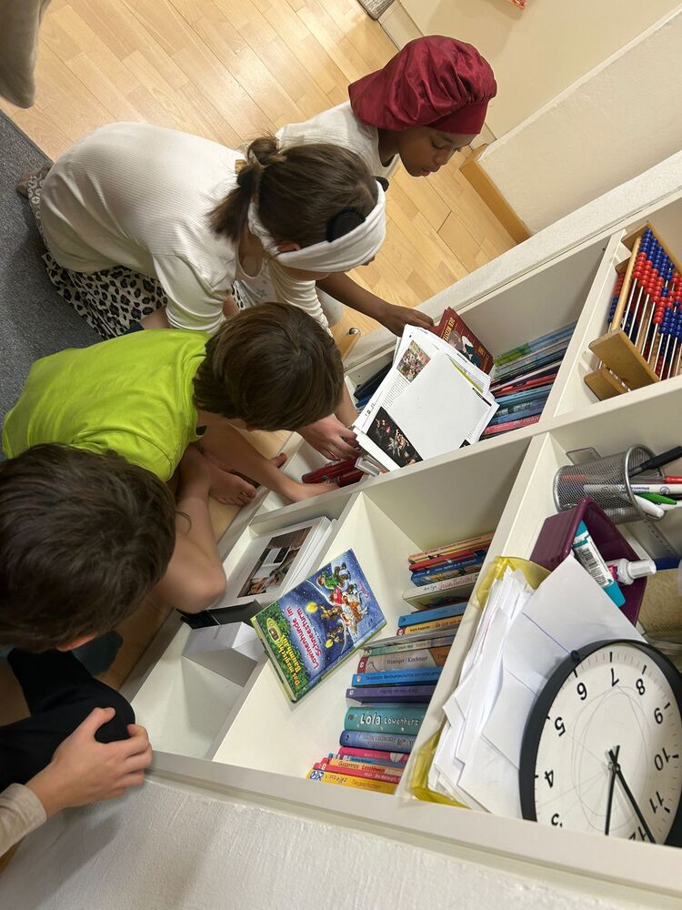 Im Anschluss begaben sich die Kinder auf eine Schatzsuche mit kniffligen Fragen. Die Hinweise sowie der Schatz waren von den Betreuerinnen in den Räumen versteckt worden. Nach dem erfolgreichen Lösen aller Aufgaben fanden die Kinder schließlich den Schatz, der Süßigkeiten, eine Taschenlampe sowie ein Lesezeichen enthielt.