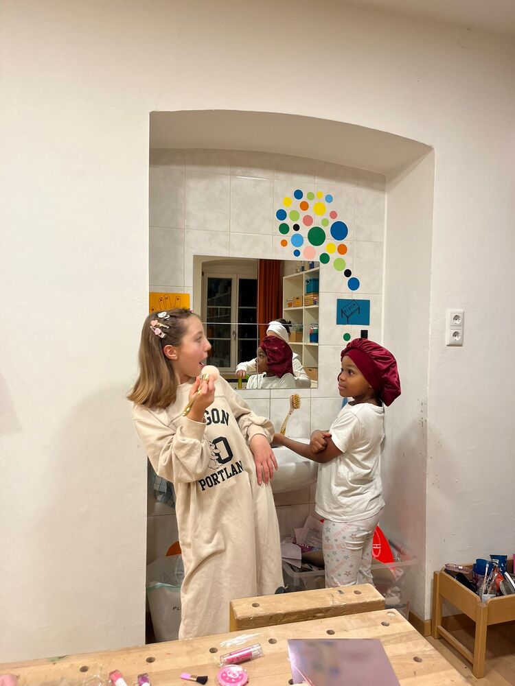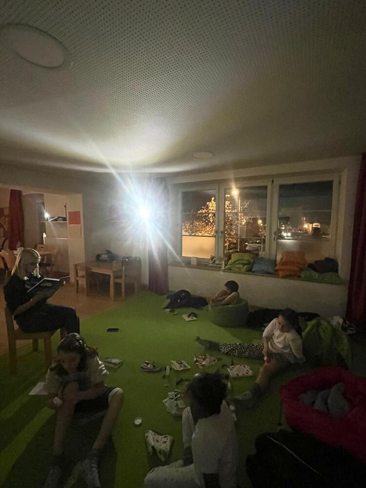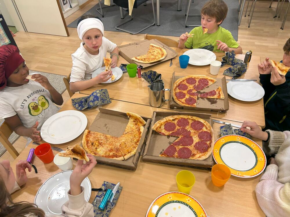 Danach spazierten wir im Pyjama zur nahegelegenen Pizzeria und aßen die Pizza anschließend gemeinsam im Hort. Nach dem Essen wurde den Kindern ein Teil des Buches „Aristide Ledoux, Meisterdieb wider Willen“ vorgelesen. Zum Abschluss hörten wir entspannte Musik und machten eine kleine Traumreise zum Thema Schneespaziergang. Einige Kinder stöberten vor dem Einschlafen noch mit ihren Taschenlampen in den Büchern.