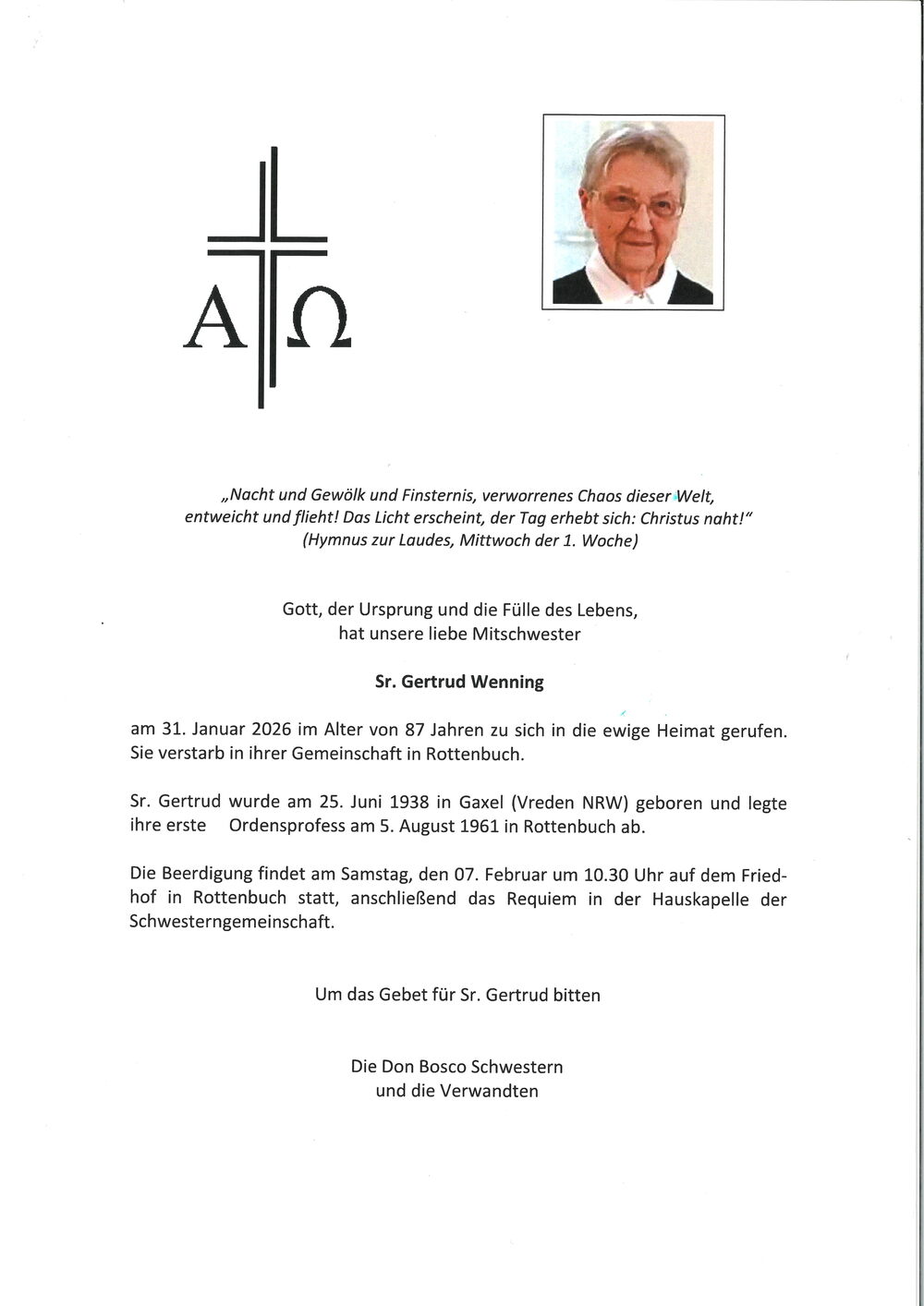 Gott, der Ursprung und die Fülle des Lebens, hat unsere liebe Mitschwester Sr. Gertrud Wenning, Tochter Mariä Hilfe der Christen (Don Bosco Schwester) am 31. Jänner 2026, im Alter von 87 Jahren, nach einem langen und erfüllten Leben, zu sich in die ewige Heimat gerufen.