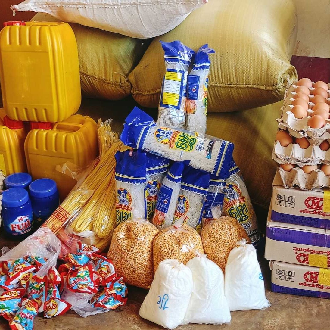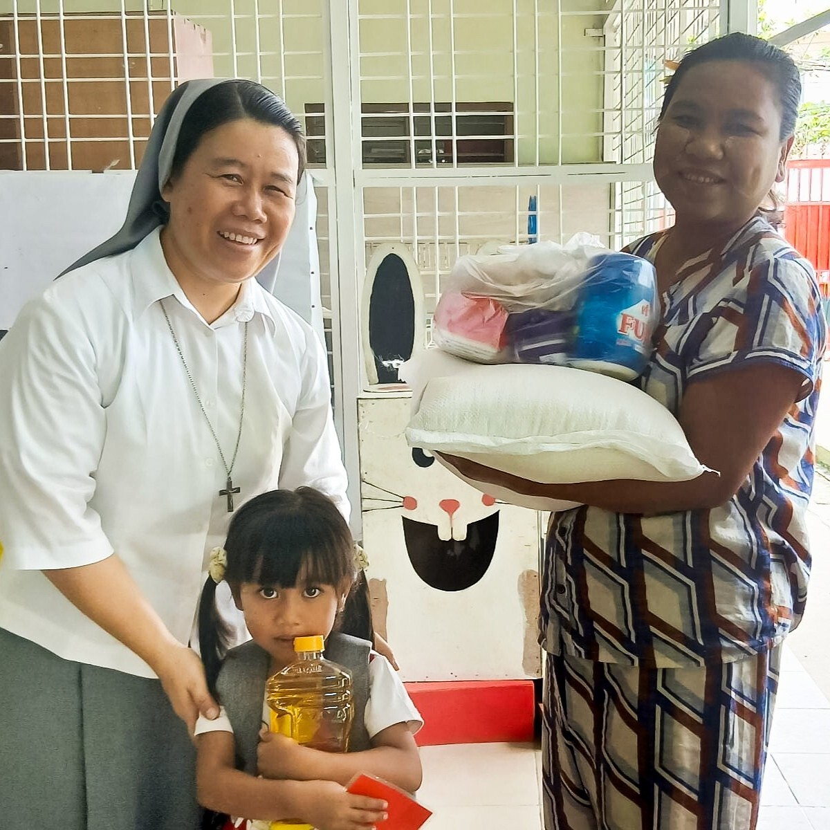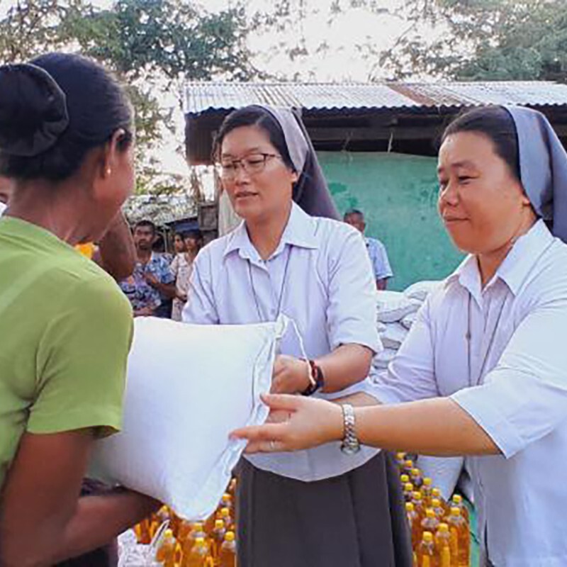 An der Seite der Menschen: Sr. Elizabeth Aung verteilt Lebensmittel an Familien, die durch Krieg oder Erdbeben in Not geraten sind.