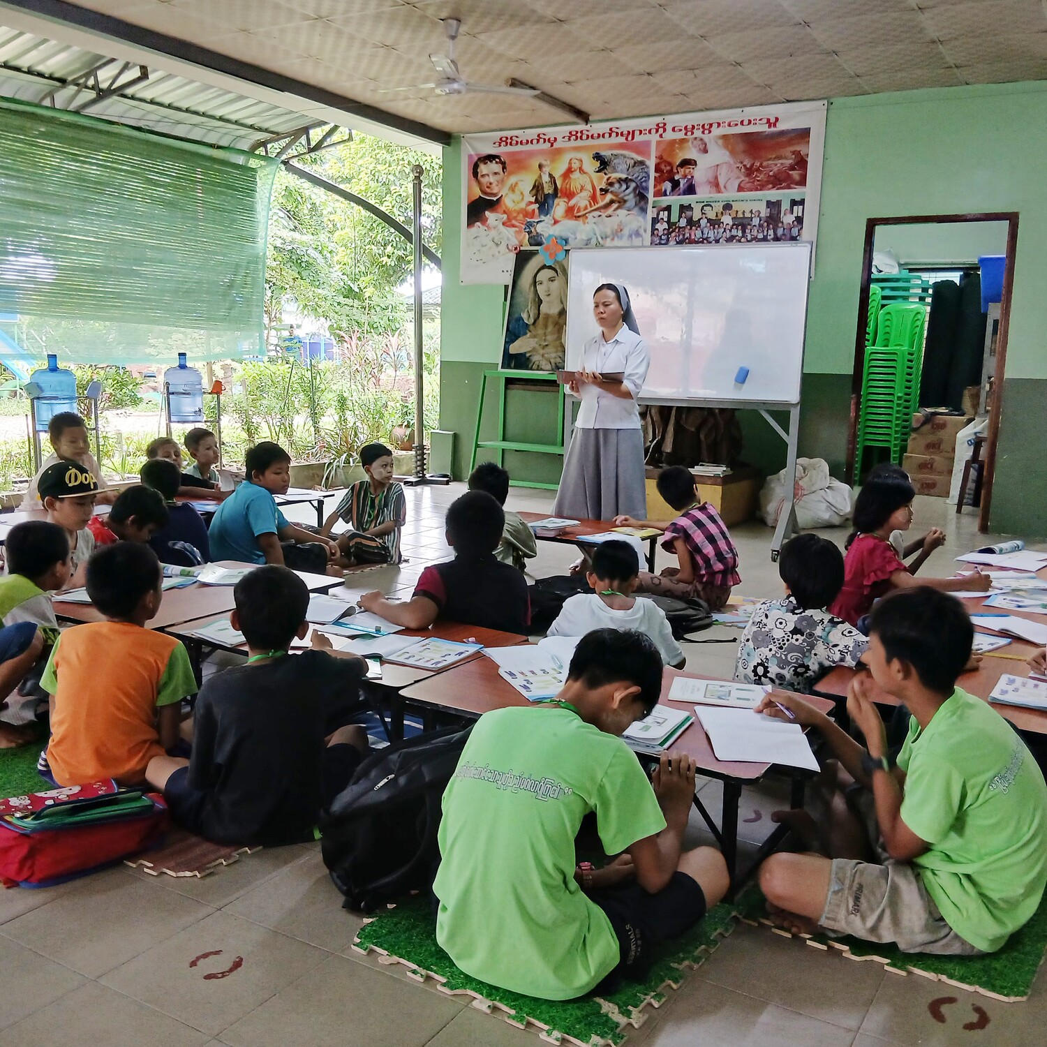 Nur wenige Kilometer entfernt liegt der Slum von Hlaing Thar Yar. Dort betreuen die Don Bosco Schwestern Kinder, die in einfachen, selbstgebauten Hütten leben. Tagsüber lernen sie Buchstaben, Zahlen oder Geschichten aus der Bibel, sie spielen, essen und lachen miteinander – und können für einen Moment einfach Kind sein.